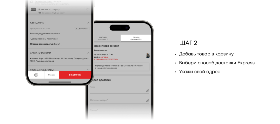 - При выборе способа доставки заказ может быть разделён на части и доставлен разными способами. Возможность Express-доставки для каждого товара проверяй в корзине.