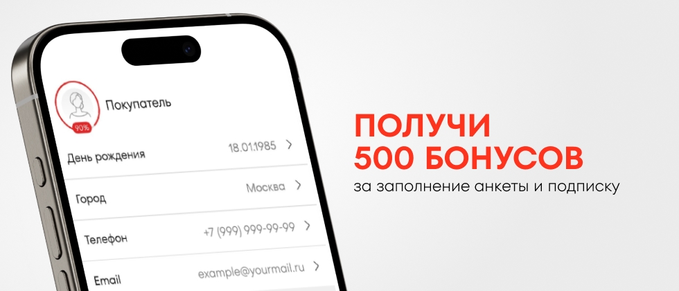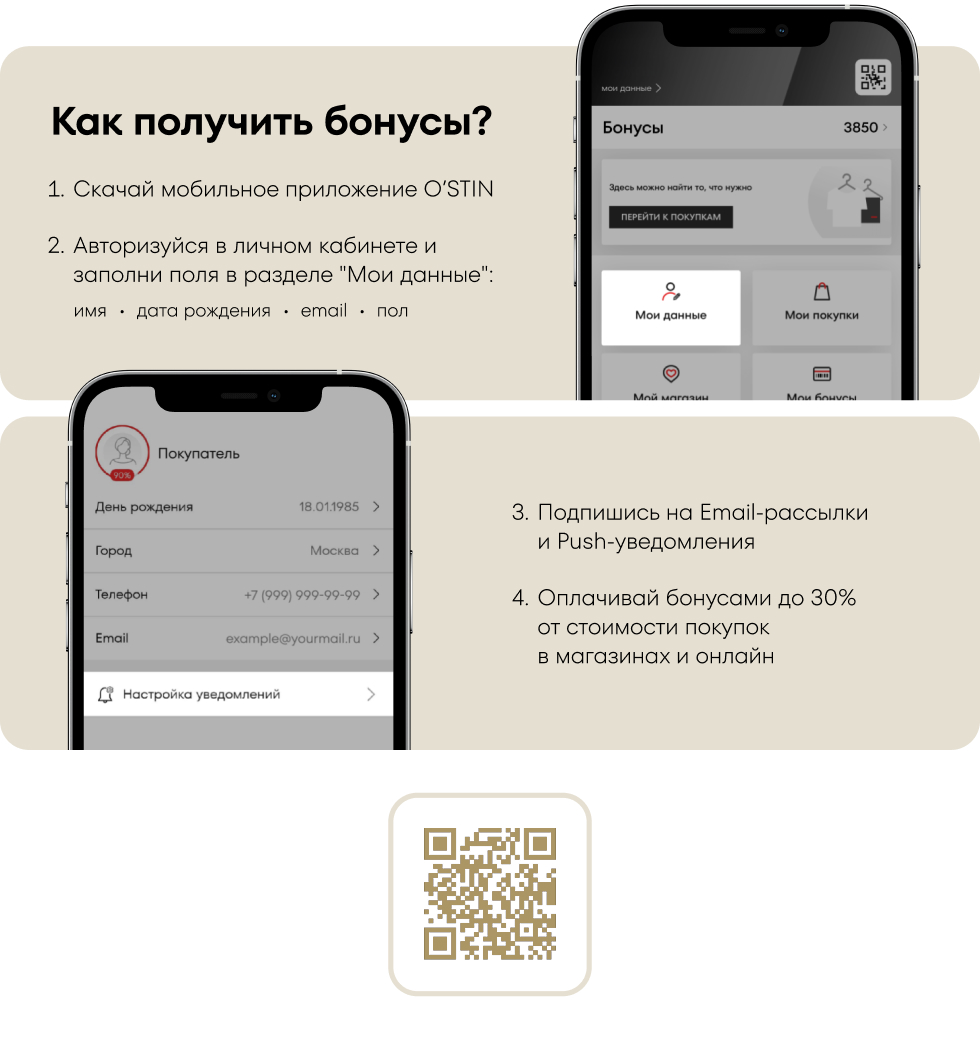 Дарим бонусы на покупки из коллекции O’STIN! Всего пару шагов – и 500 бонусов уже в личном кабинете. Заполни все данные в мобильном приложении: укажи имя, пол, email, дату рождения и номер телефона. Не забудь подписаться на нашу рассылку и push-уведомления.